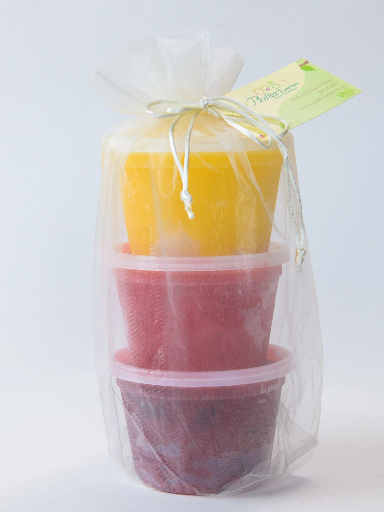 It's five pm on erev Shabbos and you realize your neighbor is making an auf ruf. but you know it's too late to order a fruit platter. Have no fear. you can still show your love with a gift from Fruit Platters and More. Our sorbet and truffles gift bag is a treat that no one will turn down. For pictures of sorbet or chocolate visit our gallery.